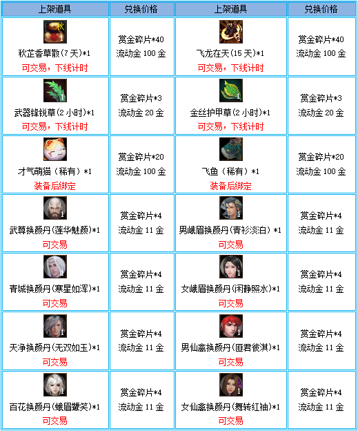 活动期间,NPC“藏宝阁阁主”处将上架以下道具: