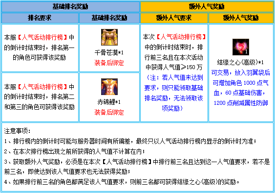 2、本活动开启前,角色已经获得的人气值不会计算在内,必须要在活动开启后获得的人气值才为有效;